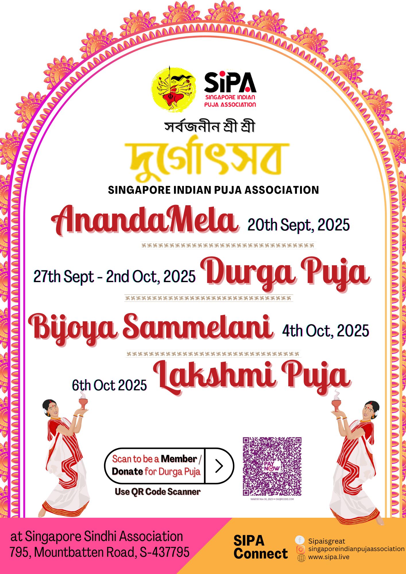 Dear Devotees and Well-Wishers, As the festive breeze returns, SIPA warmly welcomes you to Durga Puja 2025 — a celebration of devotion, unity, and culture. This isn’t just a festival—it’s a feeling. A time to reconnect, rejoice, and relive traditions that bring hearts together. From the sacred chants to the vibrant beats of dhak, from Saptarang cultural showcases to soulful rituals, we invite you to experience the spirit of Bengal right here in Singapore. This year’s Puja promises to be more inclusive, vibrant, and meaningful—with spiritual moments, cultural brilliance, and heartfelt community service. Come be part of our SIPA family. Celebrate. Connect. Cherish. May Maa Durga bless you and your loved ones abundantly. Warm regards, The SIPA Durga Puja Committee 2025